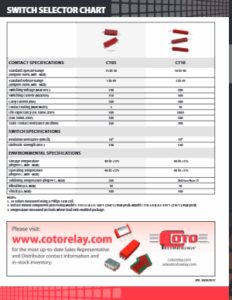 Any product, process or technology in this document may be the subject of patents or other intellectual property rights reserved by Coto Technology, Inc. or its affiliates and subsidiaries, and may not be licensed hereunder. The Coto Logo and the brick red color of reed relays and magnetically operated encapsulated reed switches manufactured by Coto are Registered Trademarks of Coto Technology Inc. All other product names, trademarks, registered trademarks, service marks or registered service marks, mentioned throughout any part of this publication belong to their respective owners.